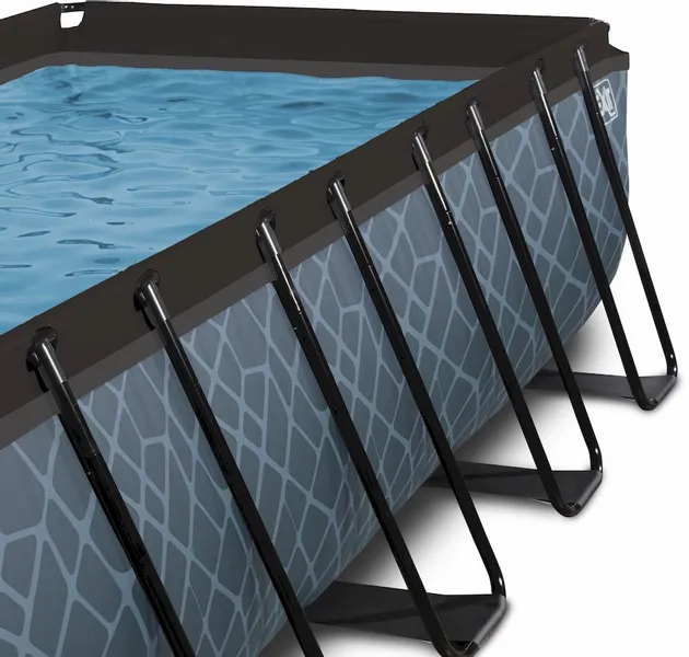 Dit Stone zwembad bevat een degelijke liner met een stoer steenpatroon, die goed combineert met het gepoedercoate zwarte frame. Het zwembad gaat daardoor mooi op in de tuin. De binnenzijde is blauw voor die mooie heldere kleur van het zwembadwater. De wanden zijn gemaakt van sterk 3-laags materiaal met een combinatie van PVC en polyester. Zo bevat het materiaal de stevigheid die nodig is voor een intensief gebruikt zwembad.