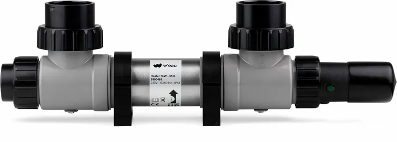 De W’eau Profi Heater gebruik je voor het verwarmen van je zwembadwater. De Profi Heater is voorzien van een regelbare thermostaat. Het binnenwerk van de behuizing en het verwarmingselement met temperatuurvoeler zijn gemaakt van roestvrij staal. De Profi Heater kan door middel van een slang (Ø25, 32 en 40 mm) of PVC buis (Ø50 en 63 mm) aangesloten worden.
